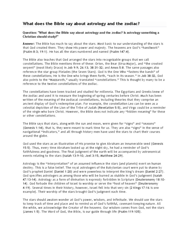 What Does the Bible Say About Astrology? (Zodiac ... The Bible teaches that astrology is sinful because it's a false and idolatrous belief system. The movements and positions of celestial bodies don't govern the ...